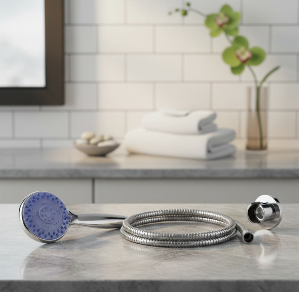 - Daugiafunkcinė dušo galvutė: Chromuotas korpusas su mėlynais purkštukais ne tik atrodo stilingai, bet ir leidžia lengvai reguliuoti vandens srovės stiprumą bei tipą (masažinė, lietaus ar kombinuota srovė).