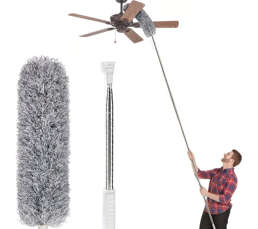 - Lanksti ir sumani galvutė: Šluostės viršūnė yra lanksti – ją galite sulenkti bet kokiu kampu (net 90°), kad idealiai nuvalytumėte lubų ventiliatorių mentes, spintų viršų ar paveikslų rėmus.