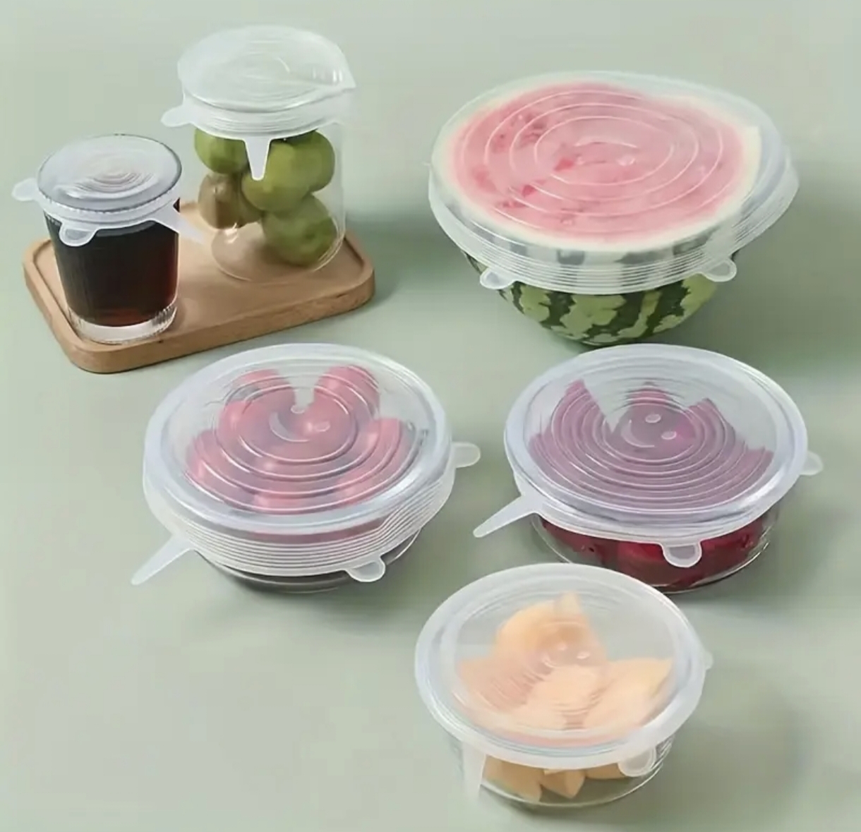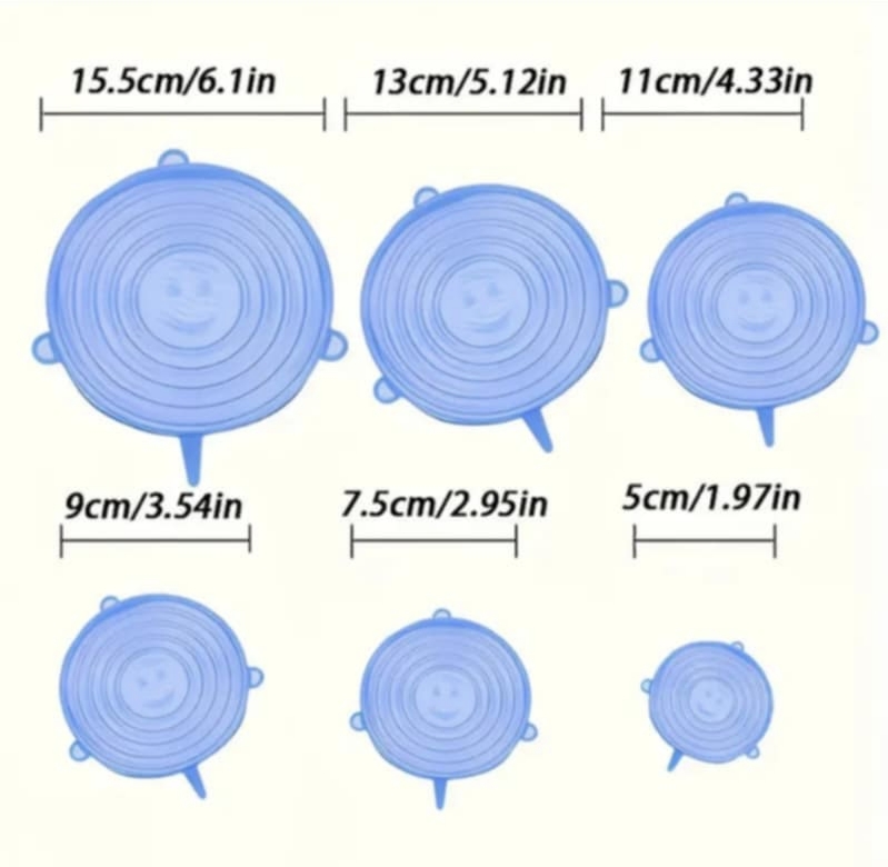Universalus pritaikymas: Rinkinyje yra 6 skirtingų dydžių dangteliai, kurie tinka puodams, dubenėliams, stiklinėms, skardinėms ir net perpjautiems vaisiams (pvz., arbūzui ar citrinai) uždengti.