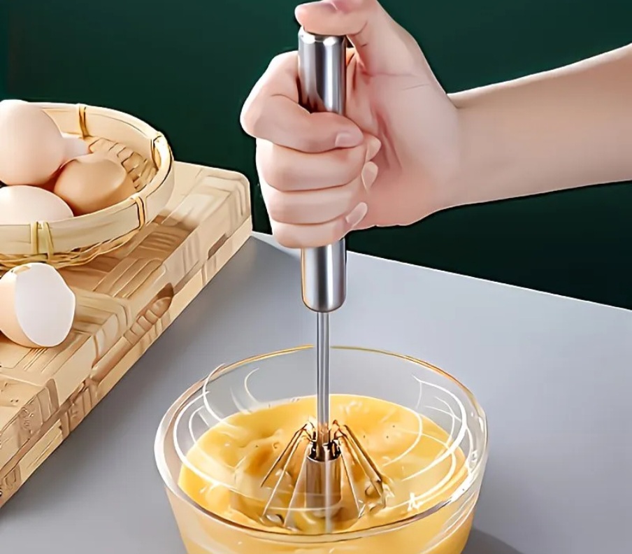 - Paprasta naudoti: Tiesiog spauskite rankeną žemyn ir atleiskite – galvutė sukasi 360^{\circ} kampu, todėl kiaušinius ar tešlą išplaksite dvigubai greičiau nei su paprastu šluotele.