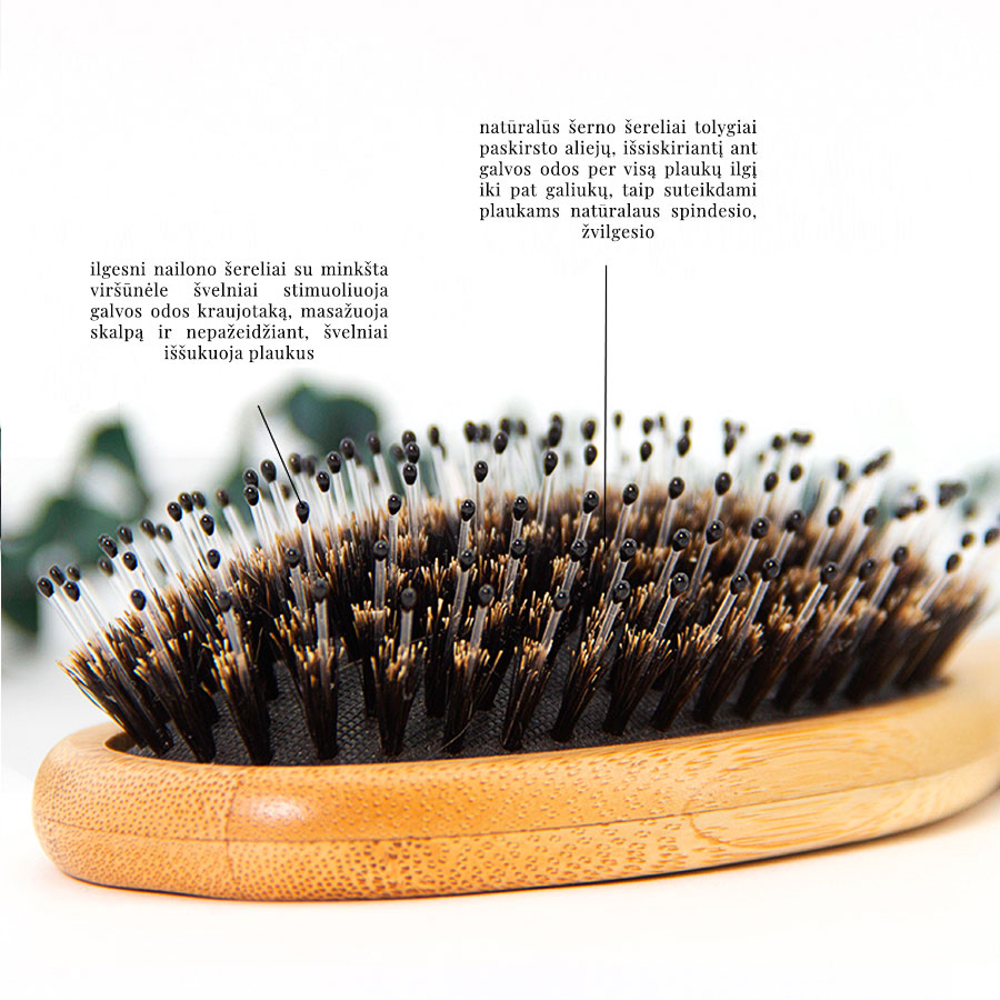 • Antistatinis poveikis: Natūralios medžiagos padeda išvengti plaukų elektrinimosi ir pūtimosi, todėl šukuosena išlieka tvarkinga visą dieną.